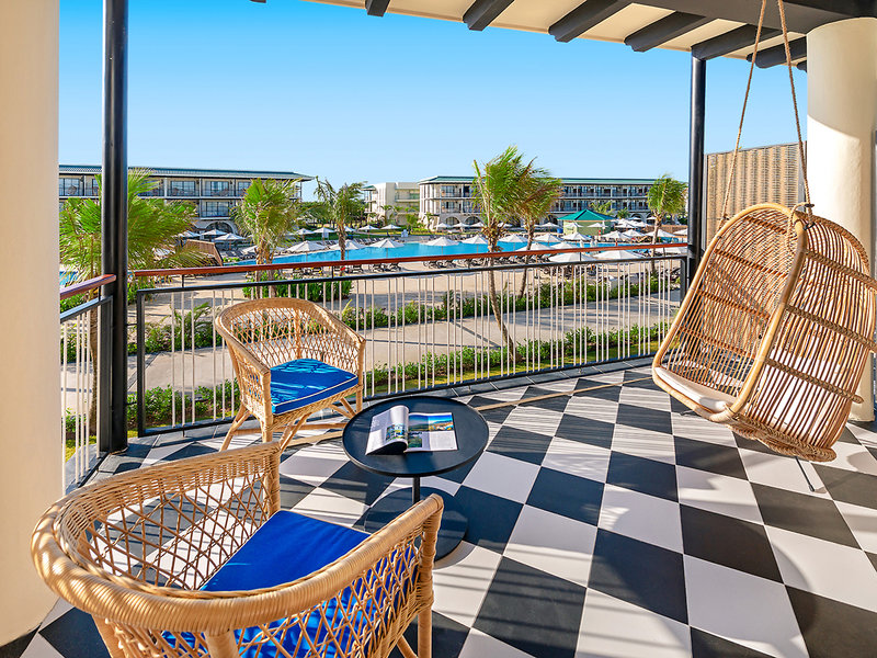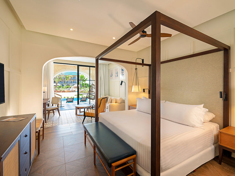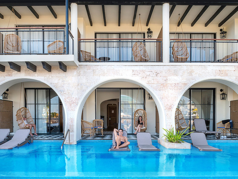 Swim-up-Juniorsuiten (JSS, ca. 53 qm, ab 18 J.), Klimaanlage, Minibar, Kaffeemaschine, TV, Telefon, WLAN, Safe, Zimmerservice. Bad oder Dusche, WC, Föhn. Terrasse. Direkter Poolzugang. Wahlweise im Adults-only-Bereich El Beso (JSU) buchbar. Max. 4E